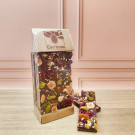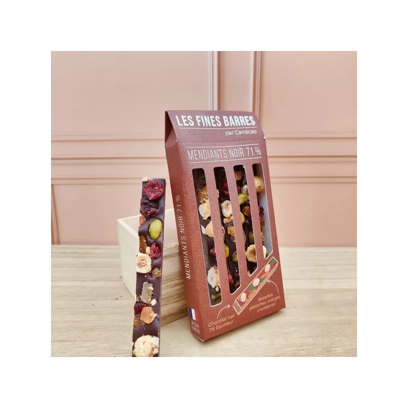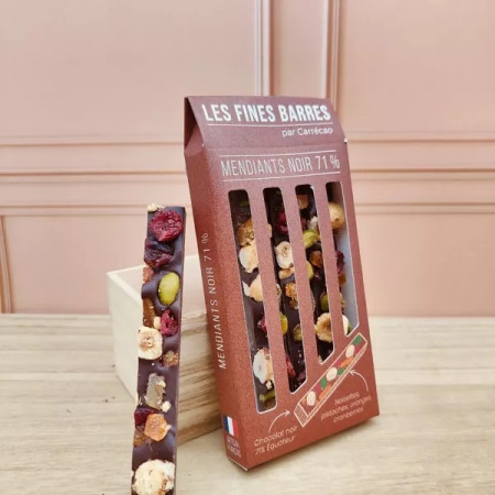 Nos mendiants sont composées d'une base en chocolat noir 71% origine Equateur, garnie de pistaches vertes, noisettes françaises caramélisées, écorces d'oranges confites, cranberries et quelques graines de sésame pour faire ressortir les différentes couleurs.