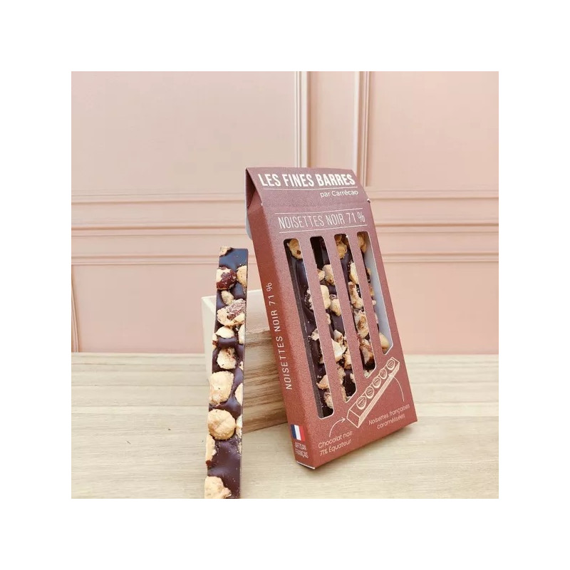Les Croq'noisettes : barrette de chocolat noir 71% origine Equateur recouverte de noisettes françaises entières subtilement sucrés/salés. De la gourmandise à l'état pur!