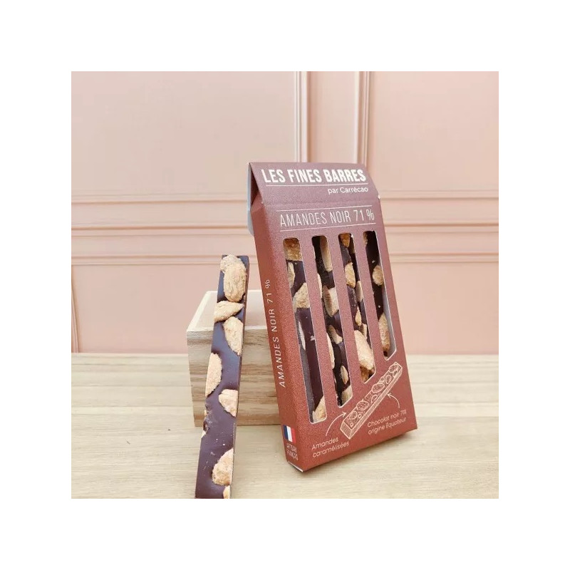 Les Croq'amandes : bâtonnets d'amandes subtilement sucrés/salés, enrobés de chocolat noir 71% origine Equateur. Le Croq'amande est idéal pour accompagner le café/le thé et combler votre gourmandise.