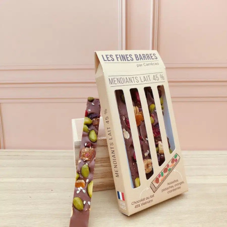 Nos mendiants sont composées d'une base en chocolat noir 71% origine Equateur, garnie de pistaches vertes, noisettes françaises caramélisées, écorces d'oranges confites, cranberries et quelques graines de sésame pour faire ressortir les différentes couleurs.