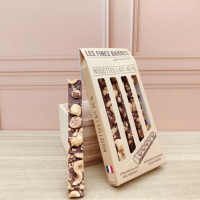 Découvrez, dans la gamme « Les Fines Barres », les barres noisettes. Des fines barres chocolatées, fabriquées à partir de noisettes entières caramélisées et de chocolat premium : Chocolat noir 71 % Équateur ou lait 45 % Vietnam.
